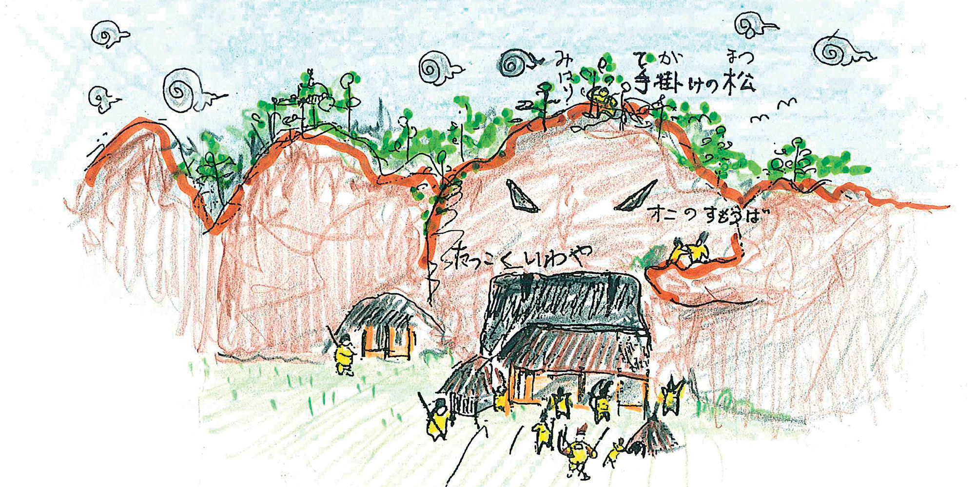 昔々、達谷窟では 蝦夷の頭 惡路王や、赤頭 髙丸が 城を造り、女の人や 子供をさらったり 宝物をうばったりしていました。