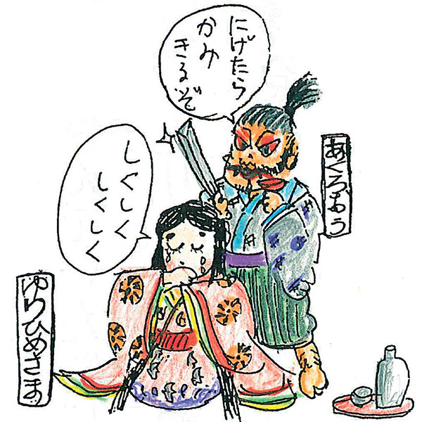ある時、惡路王らは 京の葉室中納言様の娘、ゆり姫様をゆうかいしたのです。