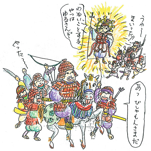 皆を助けて守るために 田村麿公が戦うと、戦の神様である 毘沙門天様が 天からおりて来て田村麿公に味方しました。
